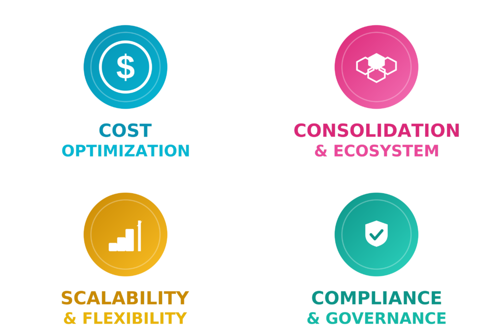 The primary driver is cost optimization. Dynamics 365 licensing is fundamentally less expensive than Salesforce. While Dynamics 365 still requires additional licenses beyond your Microsoft 365 subscription, the per-user costs are significantly lower than comparable Salesforce tiers. Beyond cost, three additional strategic factors reinforce the migration decision: consolidation & ecosystem (unified platform with Microsoft 365, Power Platform, and Azure), scalability & flexibility (adaptable architecture for growing organizations), and compliance & governance (unified security and regulatory alignment).